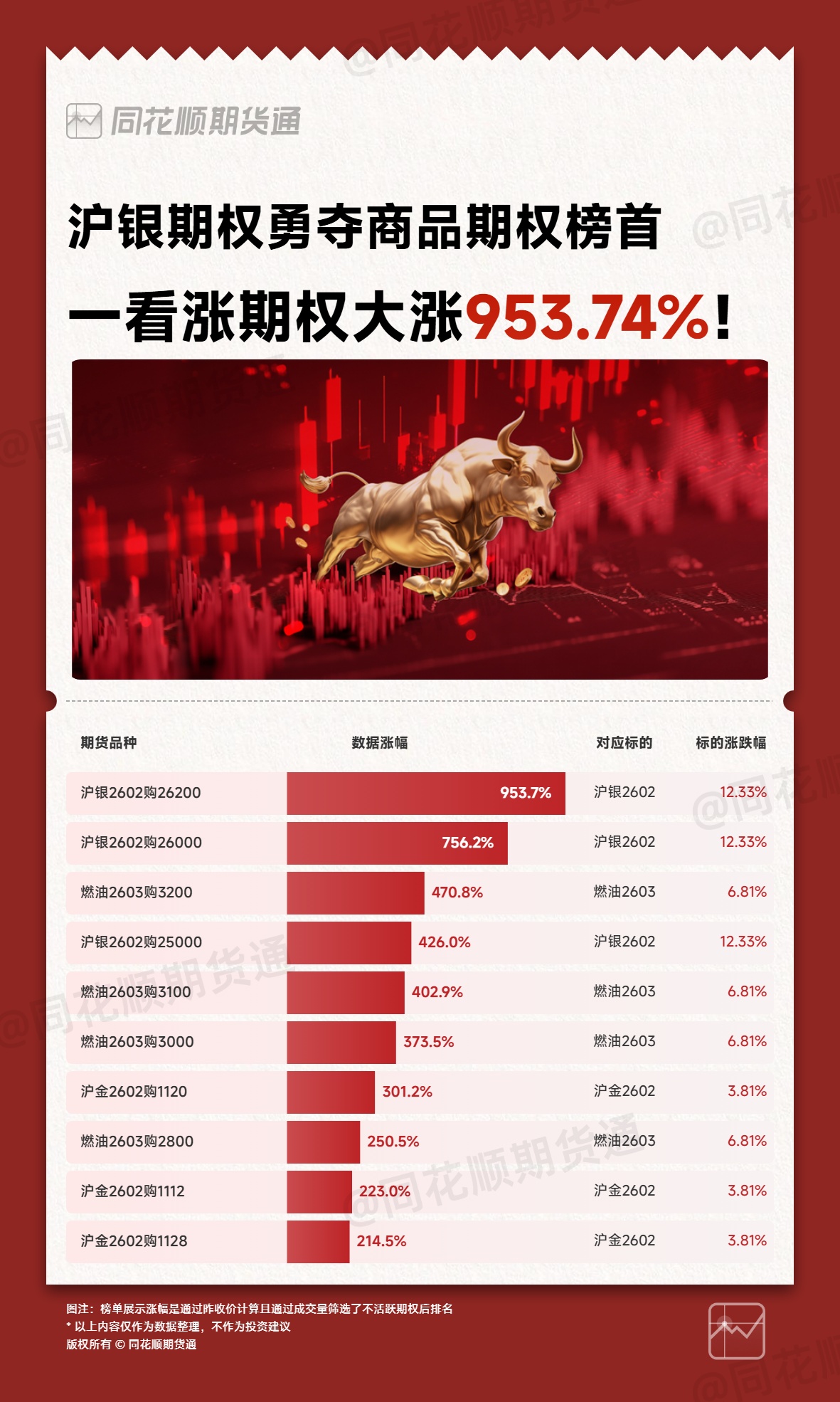 📈 避险情绪再掀高潮,贵金属与能源期权联袂爆发!沪银合约以近 10 倍涨幅霸榜,燃油、沪金期权同步冲高,上演极致杠杆盛宴,头部合约收益震撼全场: