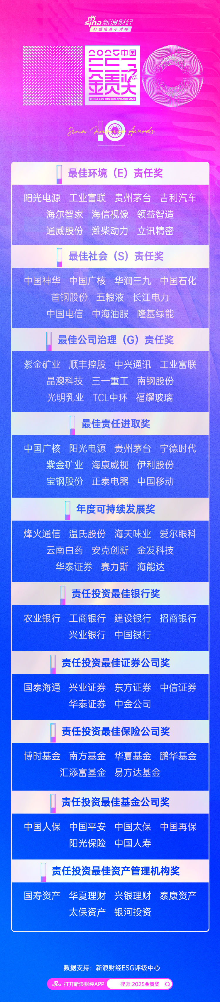 在此背景下,本着“公平、公正、公开”原则,依托权威ESG评级数据库,新浪财经于2025年11月启动了2025中国企业ESG“金责奖”评选,旨在嘉奖那些对中国ESG事业做出卓越贡献的企业和机构。本次评选设置有最佳环境(E)责任奖、最佳社会(S)责任奖、最佳公司治理(G)责任奖、最佳责任进取奖、年度可持续发展奖、责任投资最佳银行奖、责任投资最佳证券公司奖、责任投资最佳保险公司奖、责任投资最佳基金公司奖、责任投资最佳资产管理机构奖十个大奖。